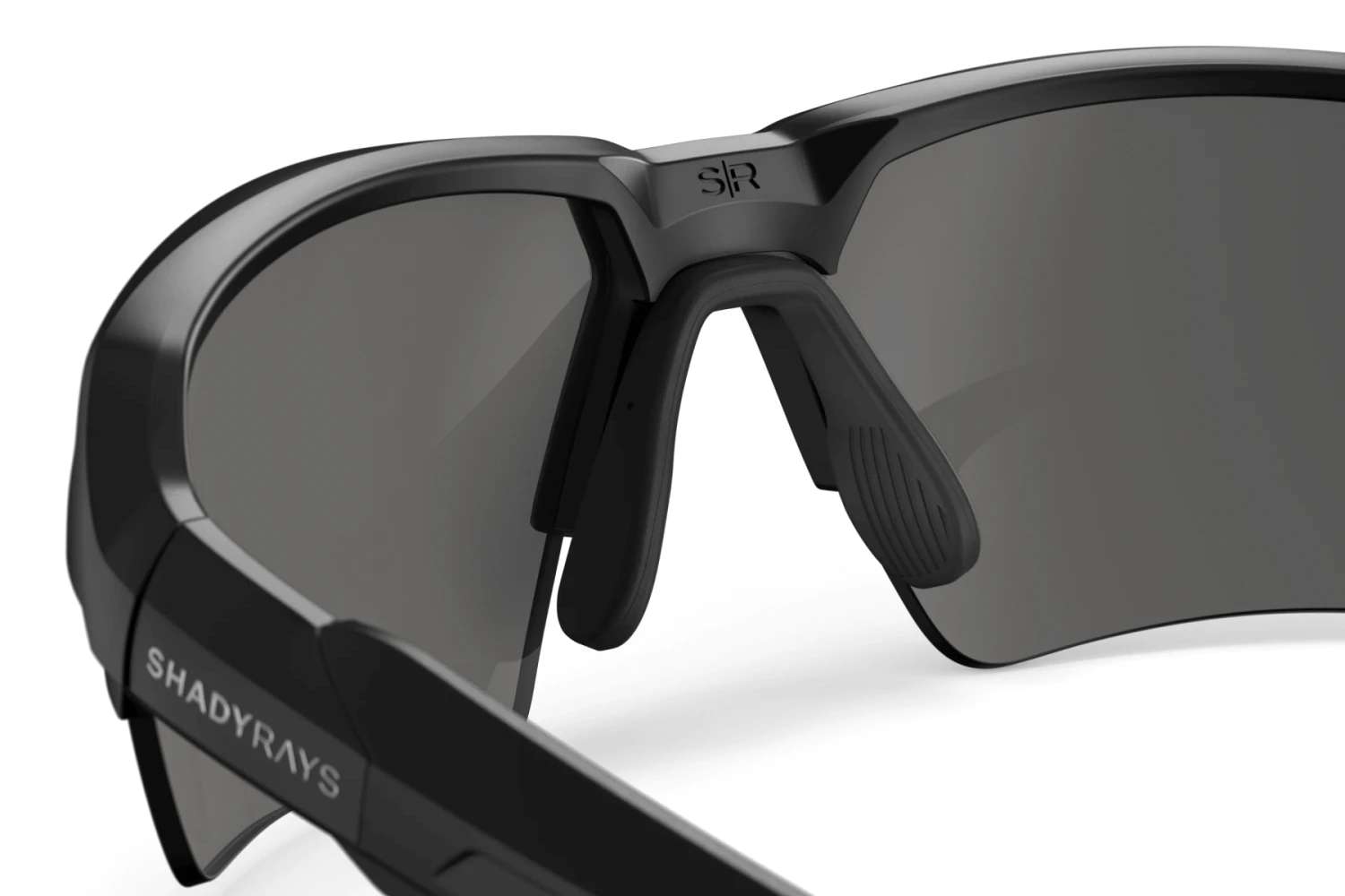 - No-slip fit- rubber adjustable nose pads with air flow sweat channels, and dual injected rubber temple tips.