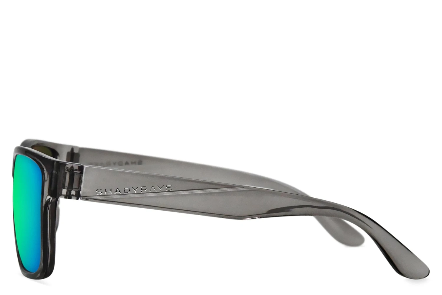 - Transparent grey gloss frame with interlocking hinges and inset metal Shady Rays logo